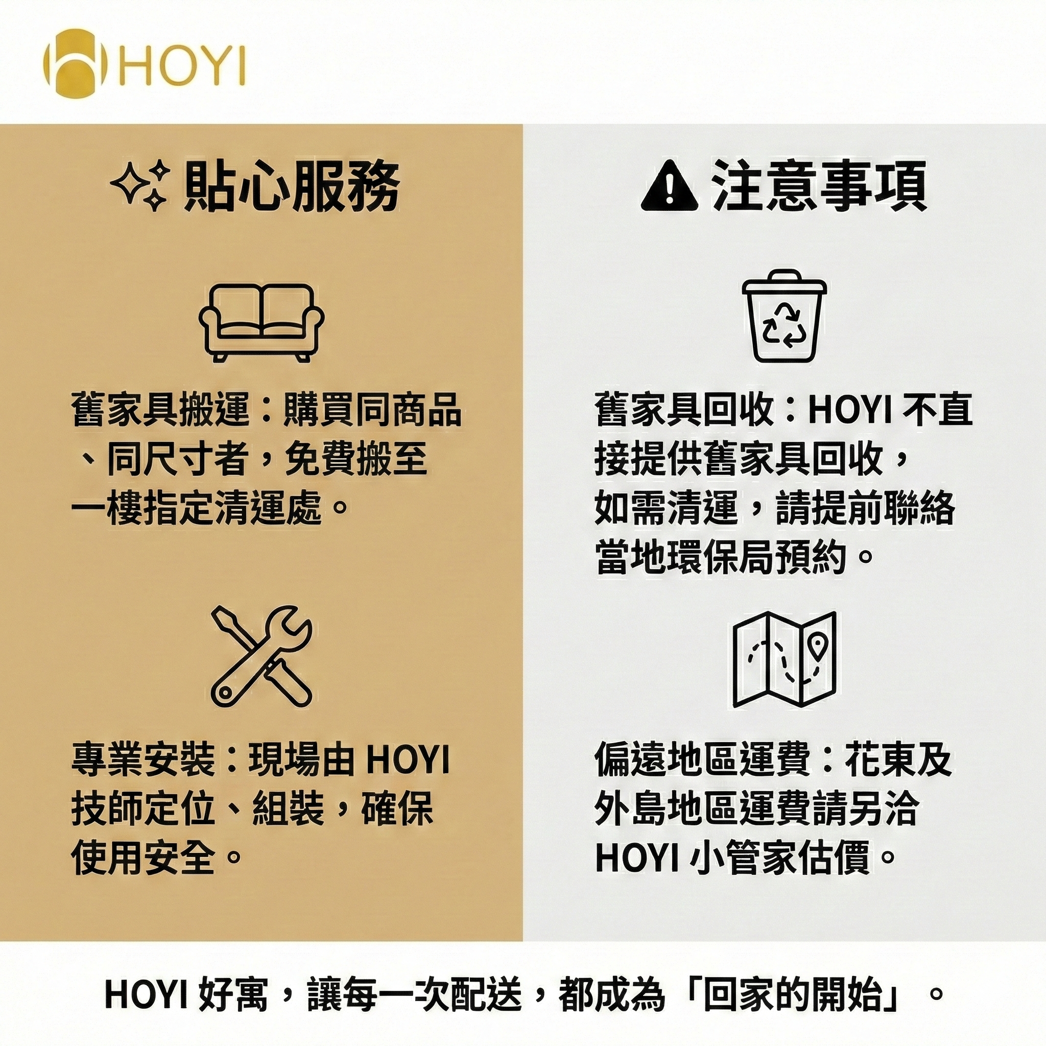 • 舊家具回收:HOYI 不直接提供舊家具回收,如需清運,請提前聯絡當地環保局預約。